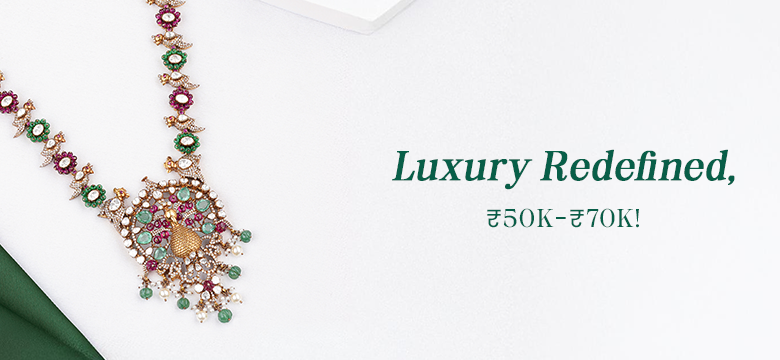 ₹ 40,368SAMPRADAYA NAKSHI LAKSHMI DESIGN NECKLACE WITH MOISSANITES EMERALD RUBY BEADS AND PEARLS