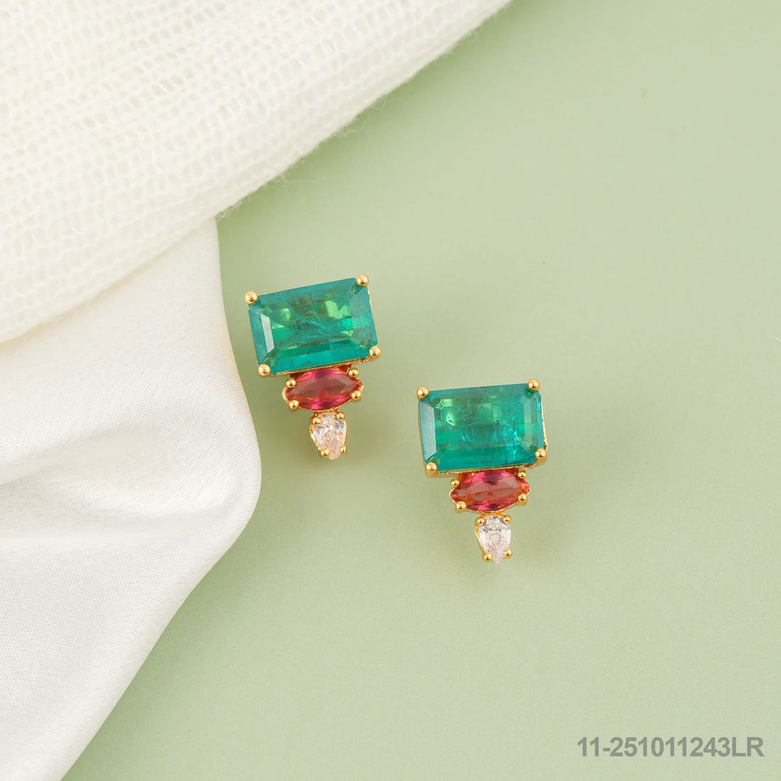 Bold geometry meets timeless elegance in the Emerald Luxe Tri-Stone Stud Earrings. Featuring a striking emerald-cut green stone at the center, enhanced by a warm ruby-toned accent and finished with a sparkling teardrop white stone, these earrings are a true statement of refined taste. Compact yet powerful in design, they bring just the right balance of color and sophistication to any attire Ð from work chic to evening glam.