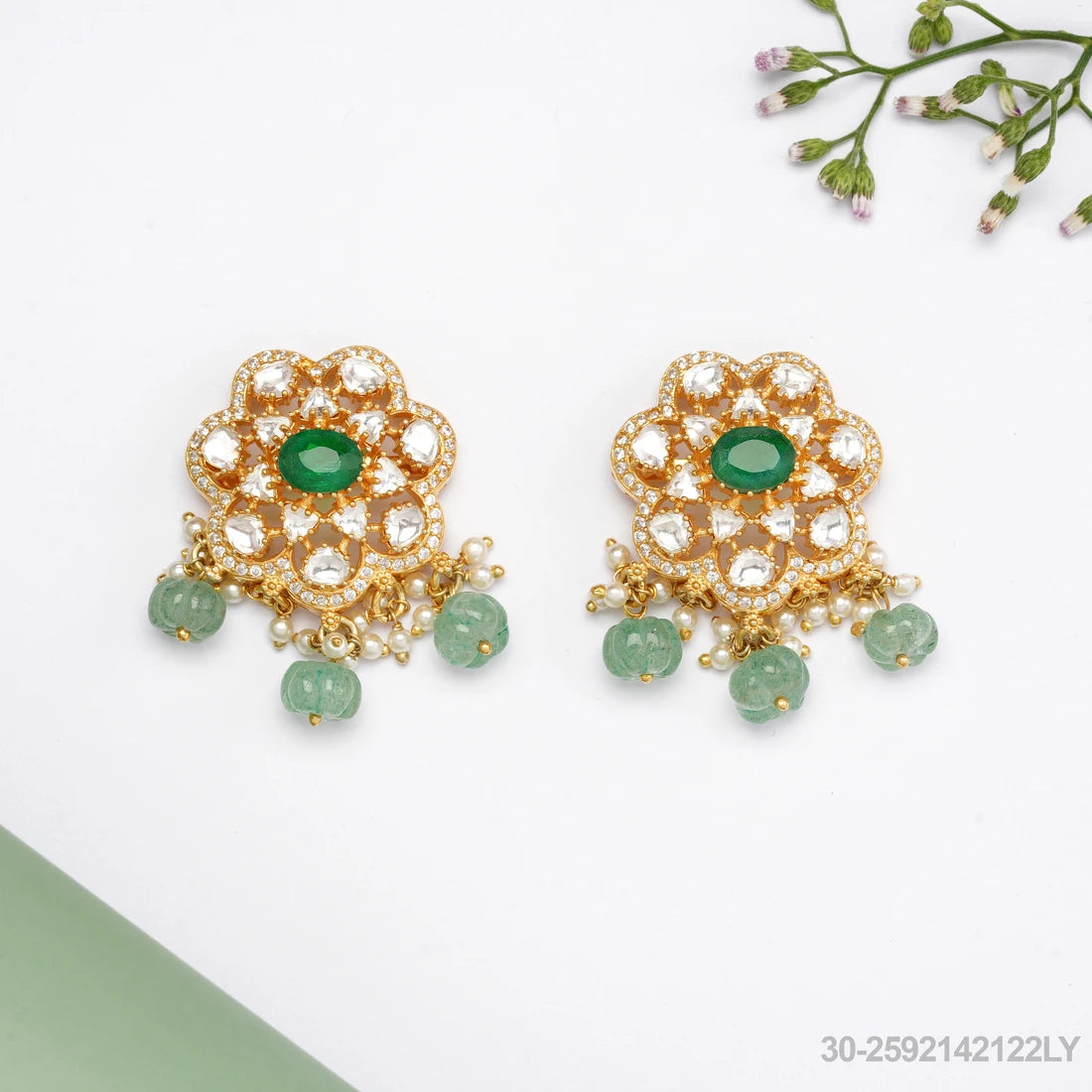 Blooming with grace, these earrings feature a radiant floral motif crafted in kundan with an emerald-green stone at the heart. The design is finished with delicate pearl droplets and green bead hangings that add a subtle yet striking movement. Ideal for festive occasions and elegant soirŽes, this piece reflects timeless beauty in every detail.