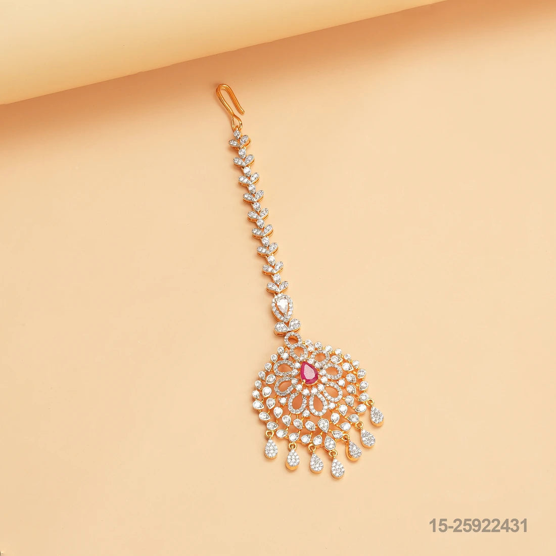 Designed to crown your look with elegance, this maang tikka features a stunning ruby teardrop centerpiece surrounded by a halo of CZ stones. The leafy CZ-studded chain flows into a grand circular motif, creating a perfect balance of sparkle and tradition. A statement accessory for weddings, engagements, and festive celebrations, it adds a regal charm to your ensemble.
