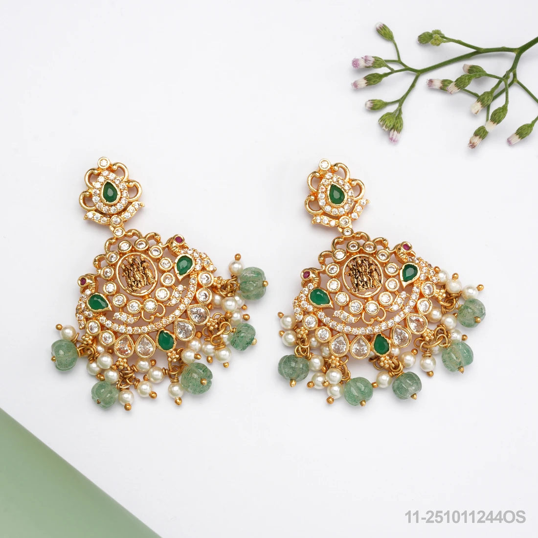 These earrings draw inspiration from temple artistry, featuring a central deity motif surrounded by kundan-set stones, emerald accents, and pearl clusters. The intricate detailing and traditional craftsmanship make them an ideal choice for weddings, festive occasions, and cultural ceremonies.