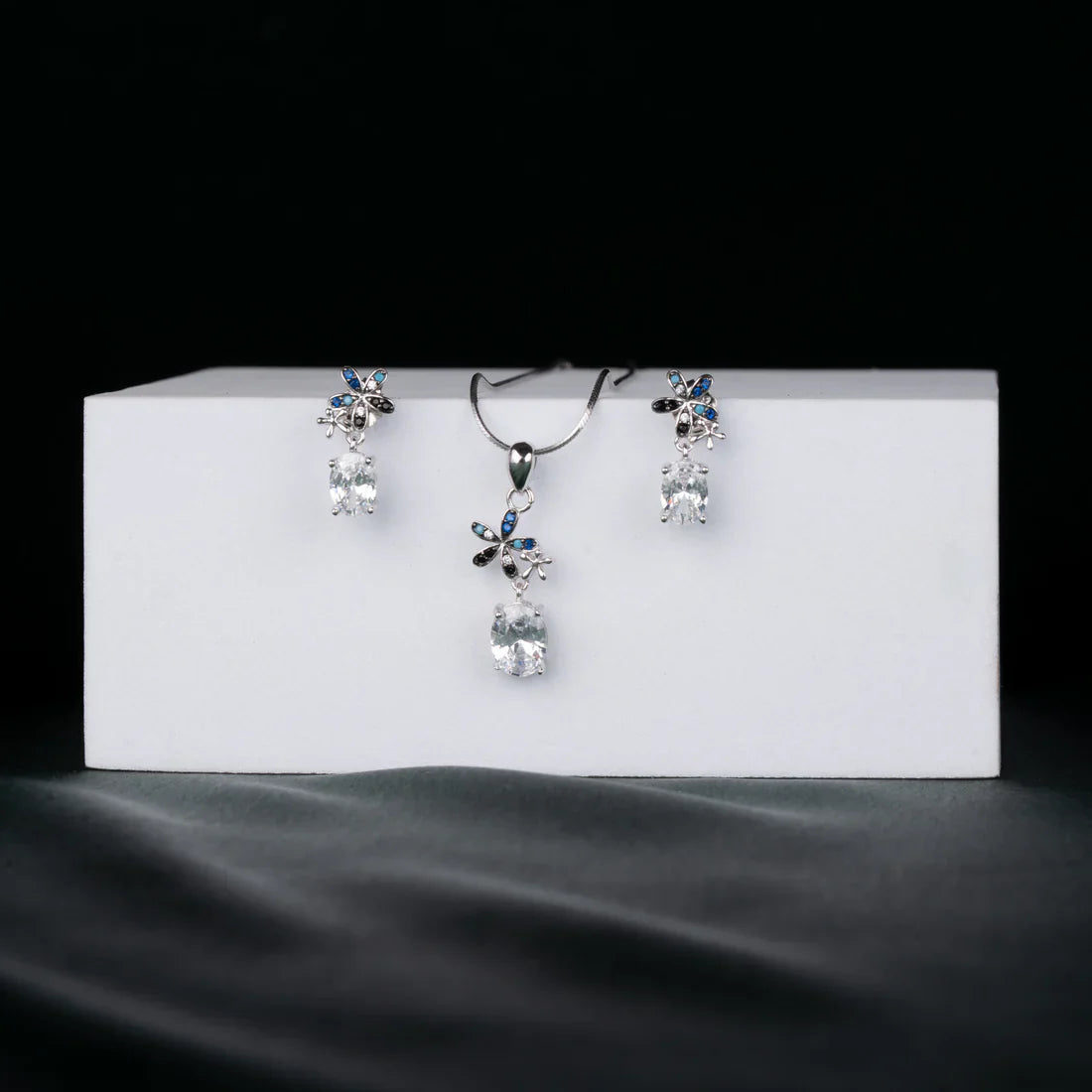 DRAGONFLY AND STONE SILVER PLATED NECKLACE SET WITH DROP EARRINGS