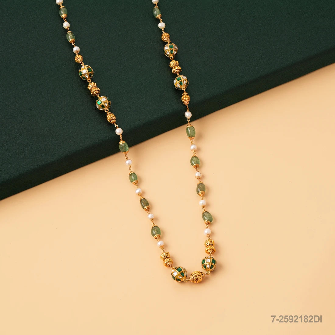 Immerse yourself in the grace of tradition with this exquisite mala featuring a rhythmic play of green beads and lustrous pearls. Handcrafted golden beads with delicate enamel work anchor the design, adding richness and depth. The necklaceÕs refined detailing and elegant length make it perfect for both festive gatherings and temple ceremonies. A versatile piece that beautifully complements ethnic wear, this mala is a timeless treasure for jewellery connoisseurs.