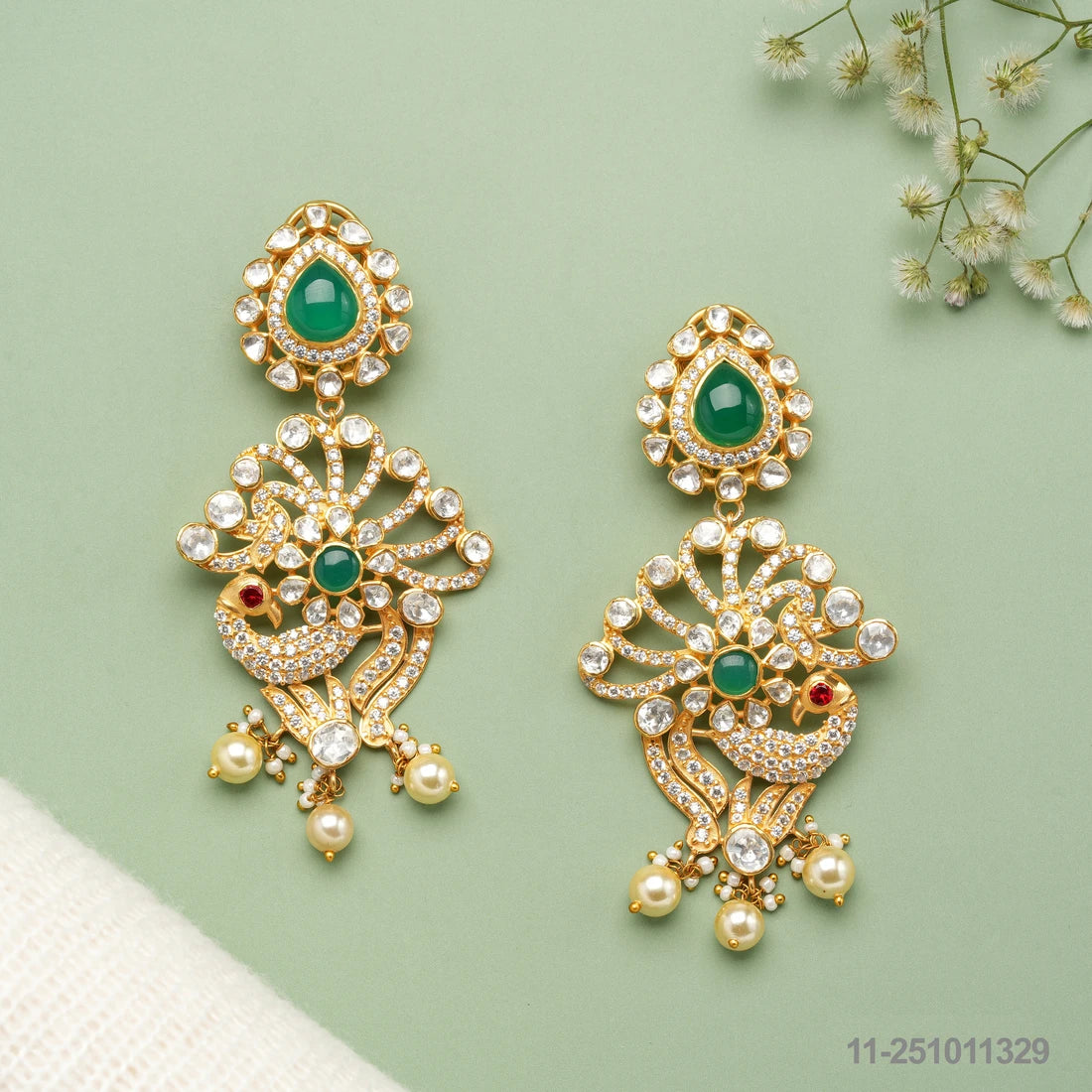 Celebrate heritage and artistry with these emerald peacock drop earrings. The design showcases a resplendent peacock motif, highlighted by a striking teardrop green stone and shimmering white crystals that trace its feathers. A subtle hint of red accent lends vibrancy, while pearl danglers complete the look with a touch of grace. Perfect for weddings, festive celebrations, and cultural occasions, these earrings blend traditional symbolism with timeless beauty.