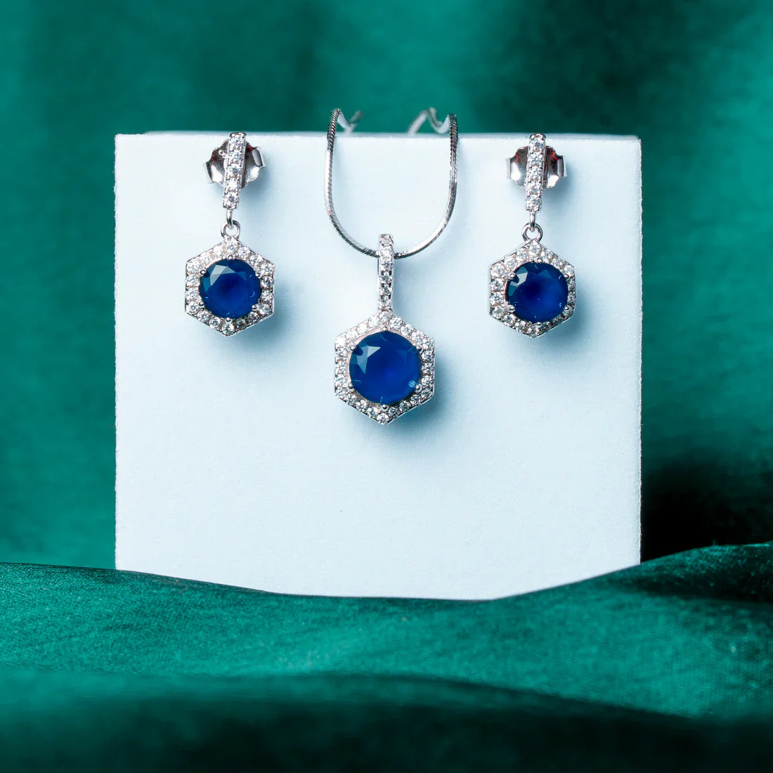 ROYAL BLUE HEXAGONAL CUBIC ZIRCONIA SILVER PLATED PENDANT SET