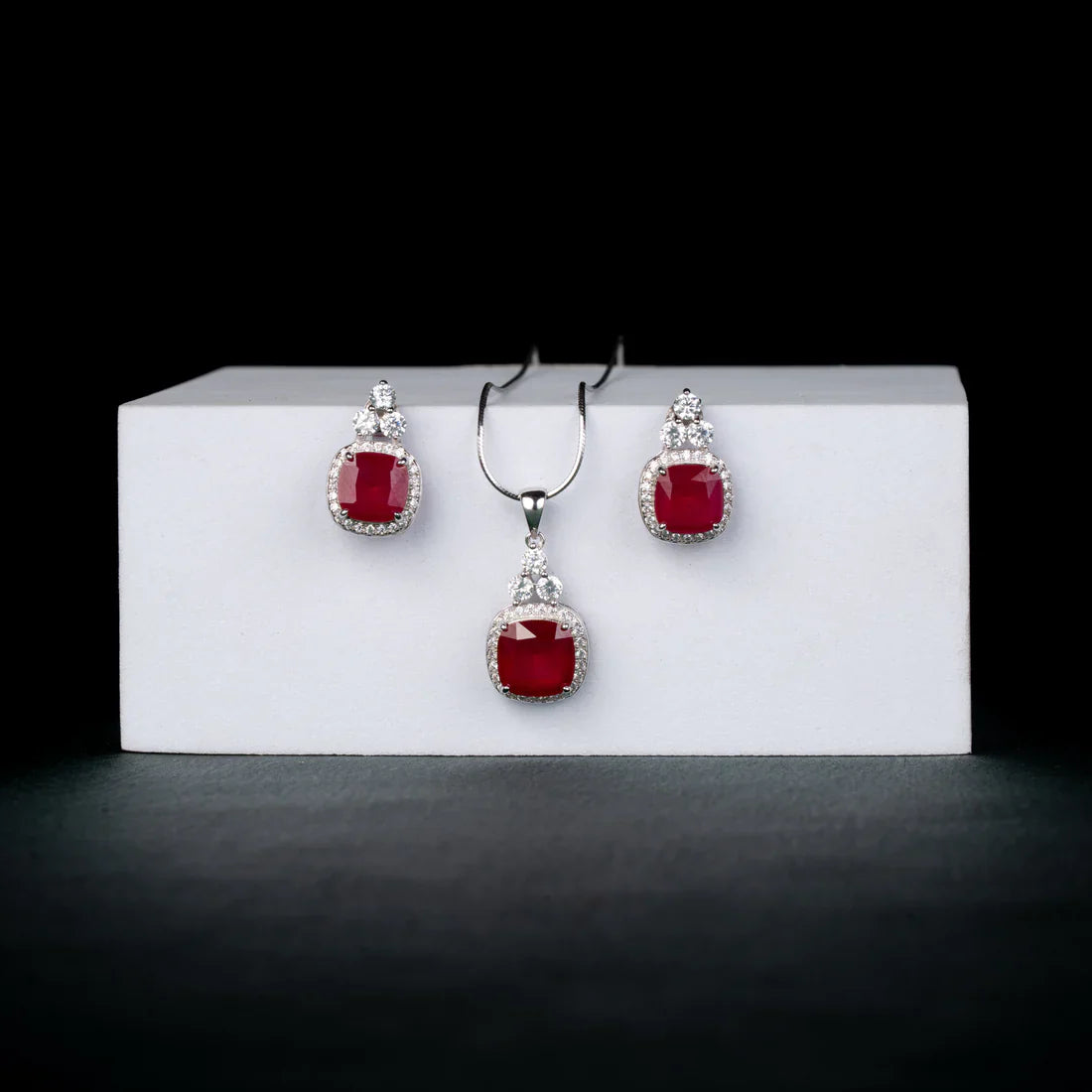 Make a bold statement with this luxurious silver-toned necklace set. Featuring a stunning cushion-cut ruby red stone surrounded by a halo of sparkling American diamonds, the pendant and matching drop earrings exude timeless glamour and sophistication. This set is perfect for festive wear, weddings, or any grand celebration.