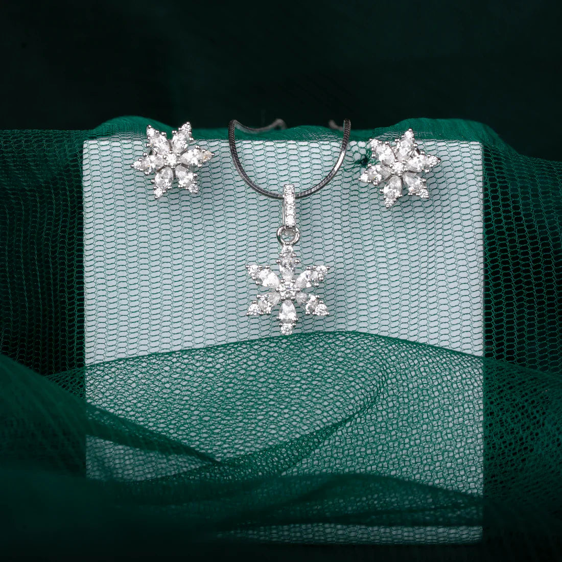 Adorn yourself with the timeless elegance of this stunning snowflake-inspired necklace set. Crafted with sparkling American diamonds, this silver-toned set includes a delicate pendant and matching earrings, perfect for adding a touch of glamour to any festive or special occasion.