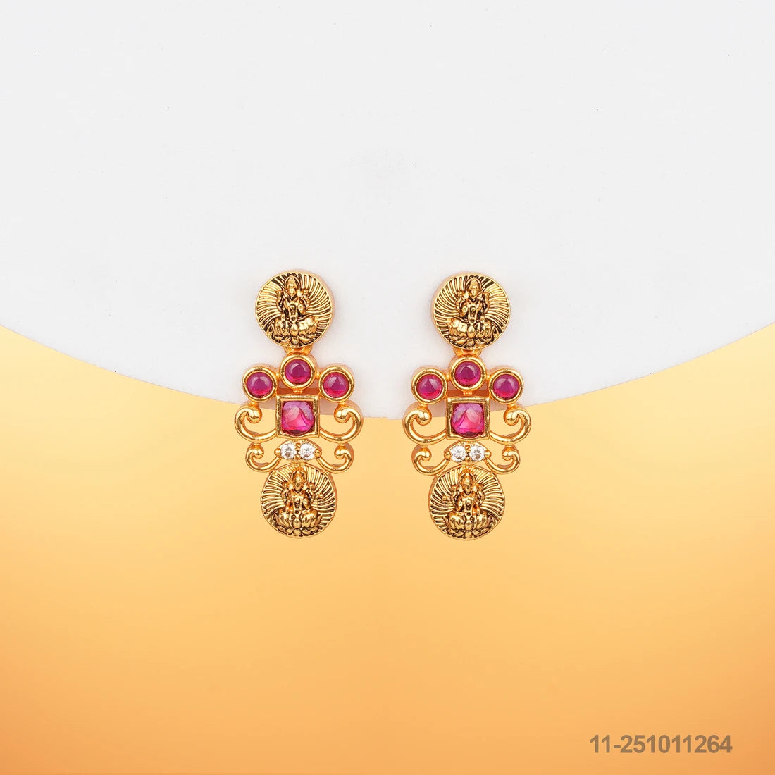 Celebrate timeless tradition with these exquisite temple-inspired earrings. Designed with antique gold motifs of divine figures, the earrings feature striking ruby pink stones accented with delicate CZ highlights. The intricate craftsmanship beautifully blends heritage artistry with modern wearability, making them perfect for festive occasions, weddings, and cultural celebrations.
