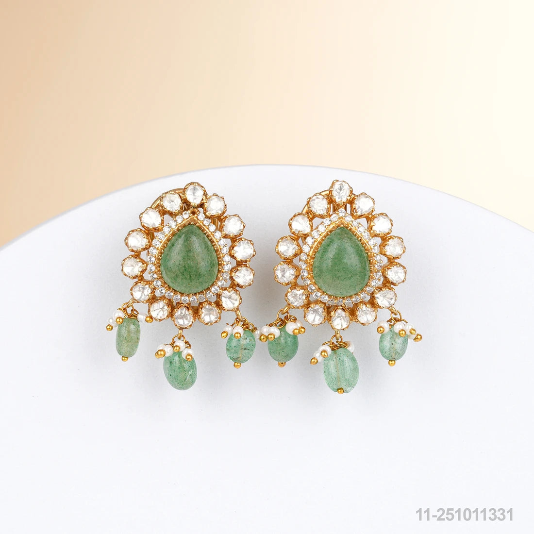 Step into elegance with these royal green teardrop earrings, adorned with a majestic cluster of shimmering stones. At the heart lies a bold green teardrop gem, framed by a radiant halo of crystals that amplify its brilliance. Dangling green beads and delicate pearl accents add a playful yet graceful movement to the design. Ideal for weddings, festive celebrations, or evening soirŽes, these earrings strike the perfect balance between regal charm and contemporary flair.