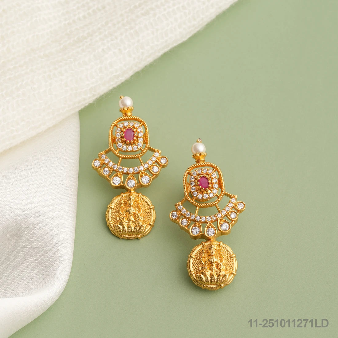 These temple-inspired earrings are a perfect blend of divine charm and ethnic elegance. Featuring a radiant ruby-hued stone set in a sparkling halo of white crystals, the design gracefully flows into a semi-circular motif embellished with CZ stones. The bottom is adorned with an intricately carved Lakshmi coin charm, symbolizing prosperity and tradition. A delicate pearl sits atop, adding a touch of grace. Ideal for festive occasions, weddings, and traditional attire.