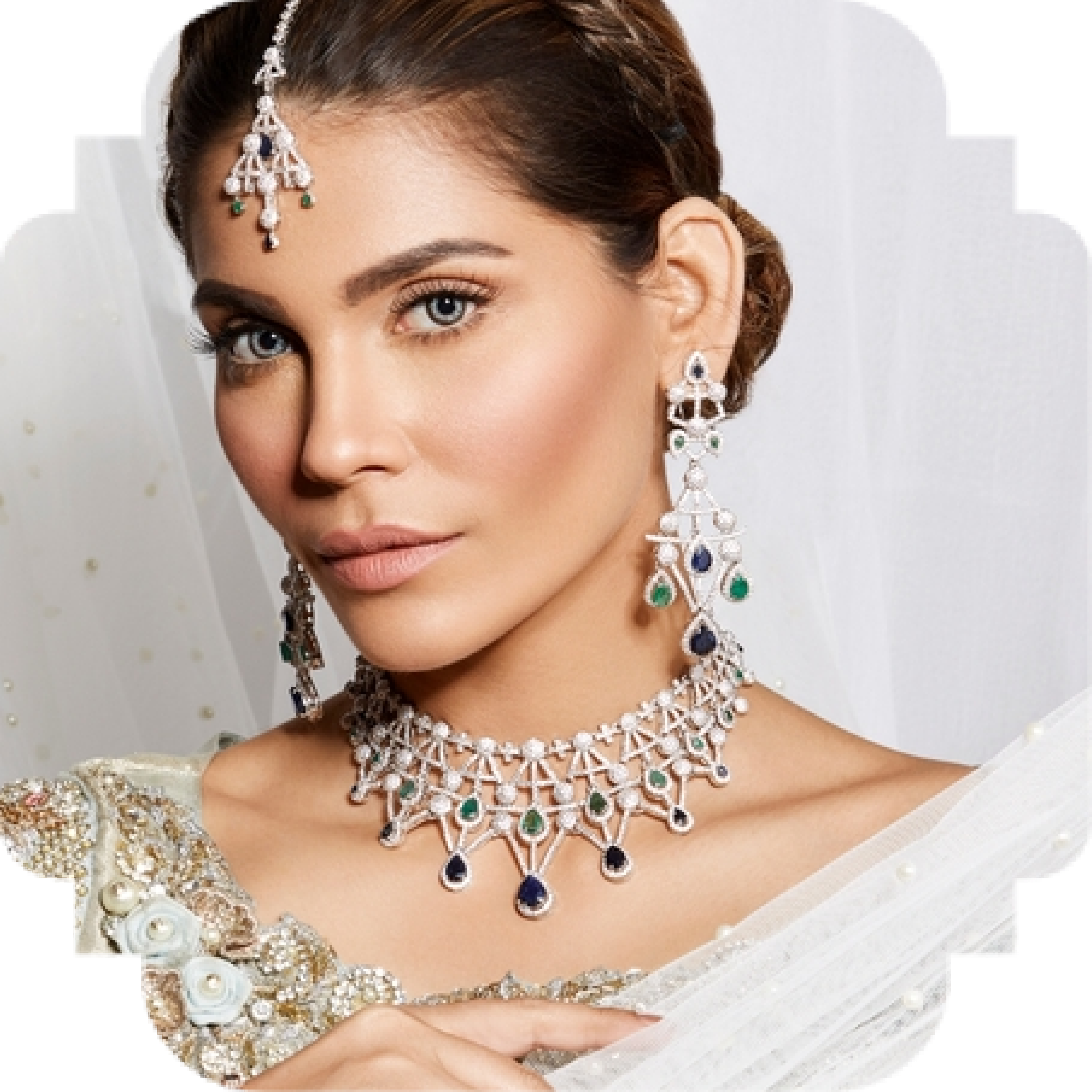 NOOR MOISSANITE PEACOCK DESIGN CHOKER WITH EMERALDS RUBIES GREEN BEADS AND PEARLS