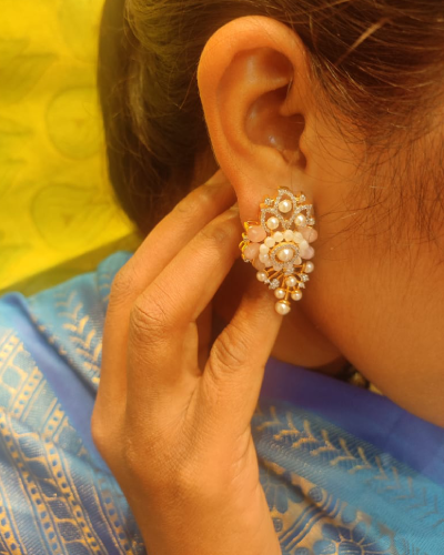 DEEPIKA CZ FLORAL DESIGN EAR STUDS WITH PINK RUSSIAN BEADS AND PEARLS