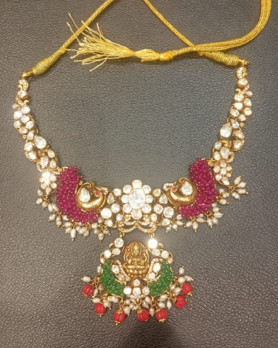 SOWJANYA NAKSHI LAKSHMI DESIGN NECKLACE WITH MOISSANITES RUBIES PEARLS AND BEADS